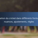 Les règles du cricket diffèrent considérablement selon les formats, principalement le Test, l'One Day International (ODI) et le Twenty20 (T20). Chaque format a des réglementations uniques concernant la durée du match, les rôles des joueurs et les méthodes de scoring, qui influencent la manière dont le jeu est joué et apprécié.